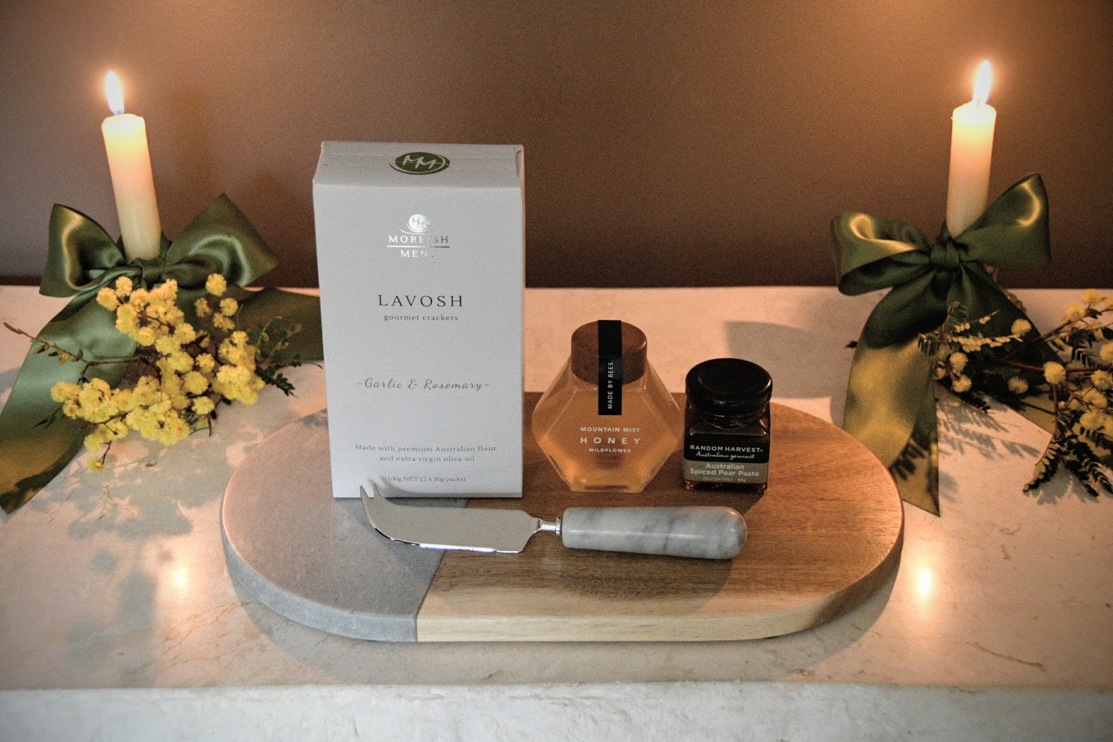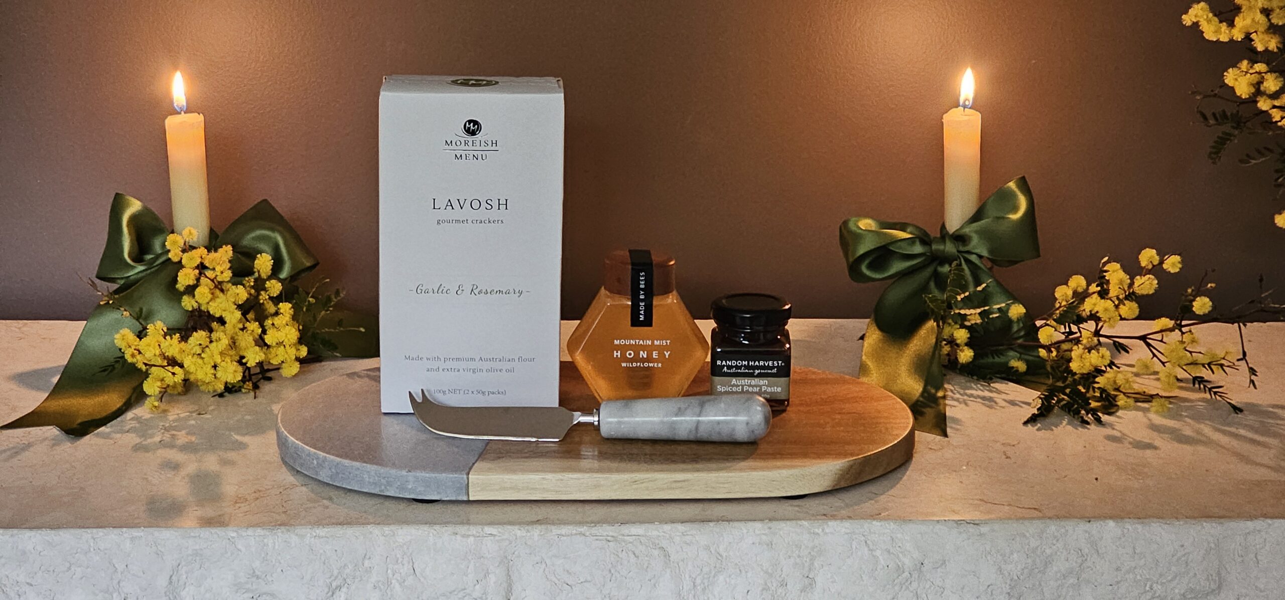 Elegant and flavourful, this grazing hamper pairs crisp lavosh crackers with wildflower honey and spiced pear paste, complemented by a marble-handled cheese knife and acacia/marble serving board – Just bring the cheese along. A sophisticated gift for clients, colleagues, or celebratory occasions. Choose from a black or white or kraft box.